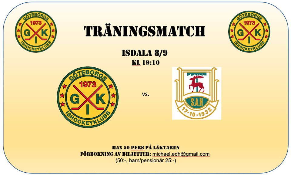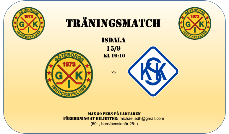 Äntligen dags för träningsmatcher! Första hemma-matchen. GIK - Sörhaga/Alingsås Isdala 8 sept., nedsläpp 19:10 P.g.a. gällande restriktioner om max 50 personer på läktaren gäller följande: - Entré 50:- (barn/pensionärer 25:-) - Inga fribiljetter - Bokning enl. ”först till kvarn” - Bokade biljetter betalas och hämtas ut senast 15 min. innan matchstart - I mån av plats kan biljetter köpas vid entrén. Biljetter bokas via e-mail: michael.edh@gmail.com Ange namn och hur många biljetter du vill boka. Välkomna !