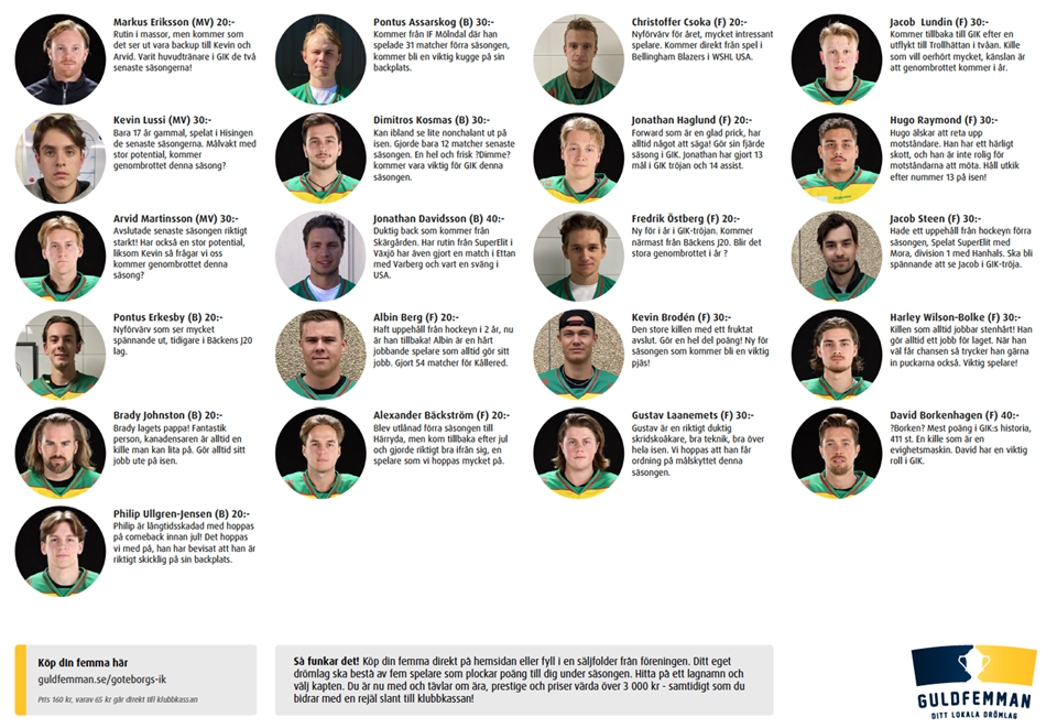 Nu är det hög tid att registrera din egen GULDFEMMA ur GIK´s trupp. Serien börjar på söndag! Så ska du vara med från början och tävla om vem som blir årets coach, klicka in på länken och registrera DIN femma. Vilka spelare kommer överraska? Passade på att få en liten kort lägesrapport från coach-Oscar: ”Det har varit lite upp och ner så här långt. Jobbigt för gubbarna när vi är kort med spelare på matcherna. Vi har lagt mycket fokus på spelet utan puck, tycker att de sett okej ut hittills. Alla gubbarna har gett järnet, Brodén, Laanemets, Steen och Davidsson ser speciellt pigga ut. Men den största jokern i årets trupp, så här långt är: Fredrik Östberg, han kan bli hur farlig som helst i år". Snabba dig och registrera de fem gubbarna som du tror gör bäst ifrån sig i år. (all info finns i länken) GIK Guldfemma Lycka till!