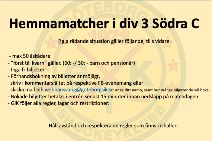 Hemmamatcher i div 3 Södra C P.g.a rådande situation gäller följande, tills vidare: - max 50 åskådare - ”först till kvarn” gäller. (60: -/ 30: - barn och pensionär) - Inga fribiljetter - Förhandsbokning av biljetter är möjligt, skriv i kommentarsfältet på respektive FB-evenemang eller skicka mail till: webbansvarig@goteborgsik.se ange ditt namn, samt hur många biljetter du vill boka. - Bokade biljetter betalas i entrén senast 15 minuter innan nedsläpp på matchdagen. - GIK följer alla regler, lagar och restriktioner: Håll avstånd och respektera de regler som finns i ishallen.