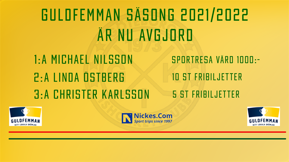 I och med att Alltrean är färdigspelad, så avslutas också årets upplaga av Guldfemman. Segrare och GIK´s bäste coach blev: Michael Nilsson med sitt lag ”Mediafemman”. Han skrapar därmed hem första pris som är ett presentkort på sportresor, värt 1000:-. Tvåa kom Linda Östberg med sitt lag ”Stjärngossarna”. Hon vinner därmed 10 st fribiljetter till nästa säsongs matcher. Trea kom Christer Karlsson med sitt lag ”Team Salvum”, som belönas med 5 st fribiljetter. GIK tackar alla ”coacher” som varit med denna säsongen. Missade du årets upplaga? Lugn... vi kommer tillbaka med en ny upplaga av GULDFEMMAN inför nästa säsong. Tack för denna upplaga av Guldfemman //GIK Göteborgs IK 21 mar 2022 0kommentarer
