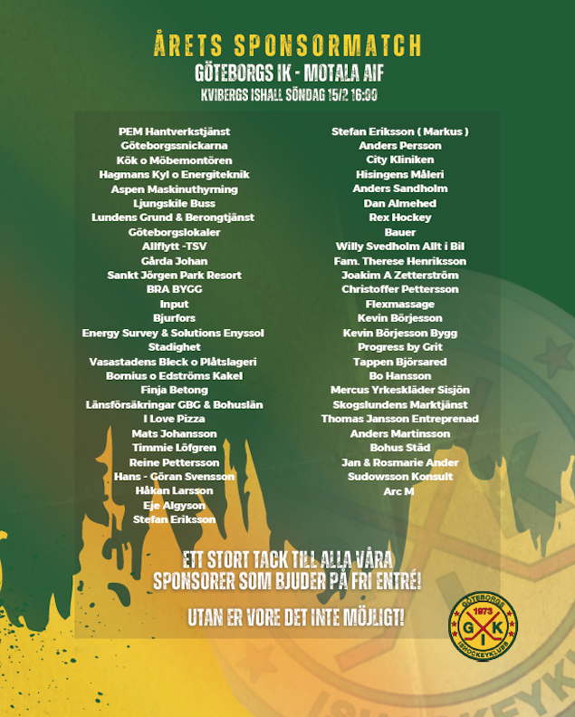 Nu är det äntligen dags för den årliga sponsormatchen ! Söndag 15/2, nedsläpp 16:00. GIK - MOTALA AIF Tack vare våra sponsorer är det FRI ENTRE. Välkomna !
